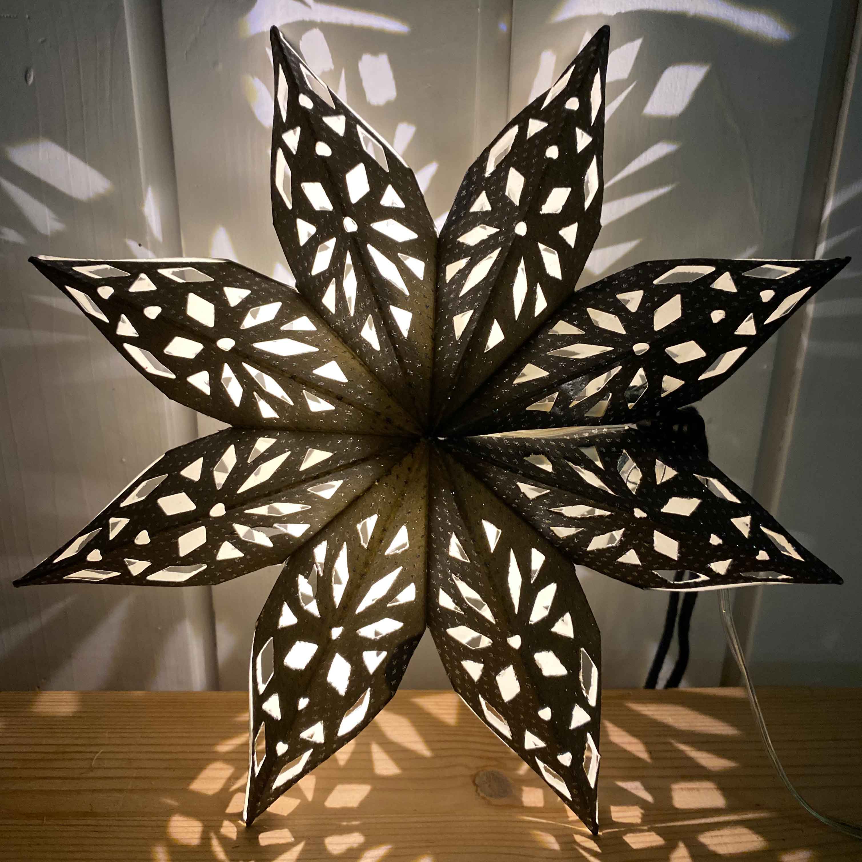 Diese Schneeflocke ist in Origamitechnik von Hand gefaltet und mit dem beigefügten Elektrokabel beleuchtbar.