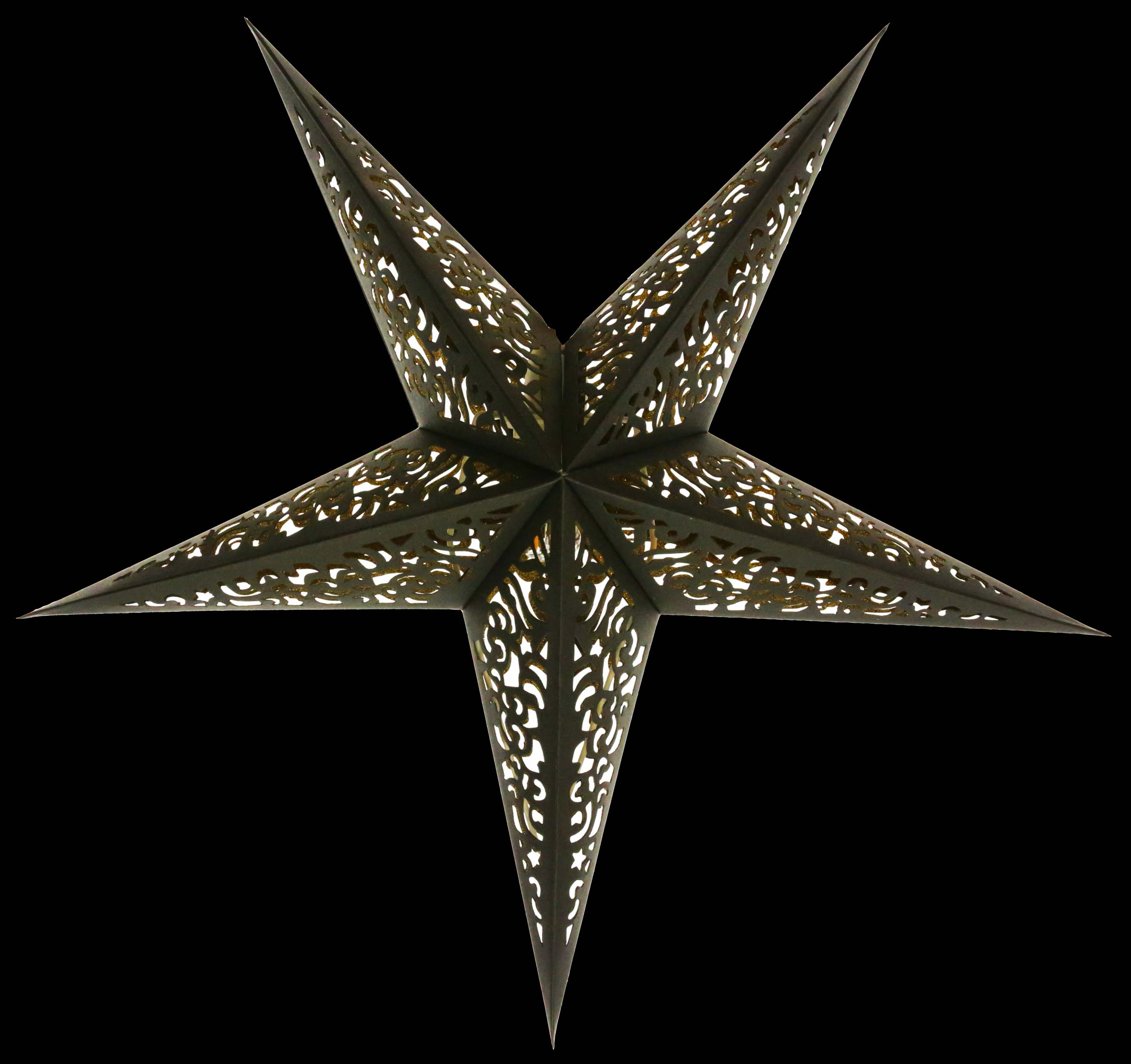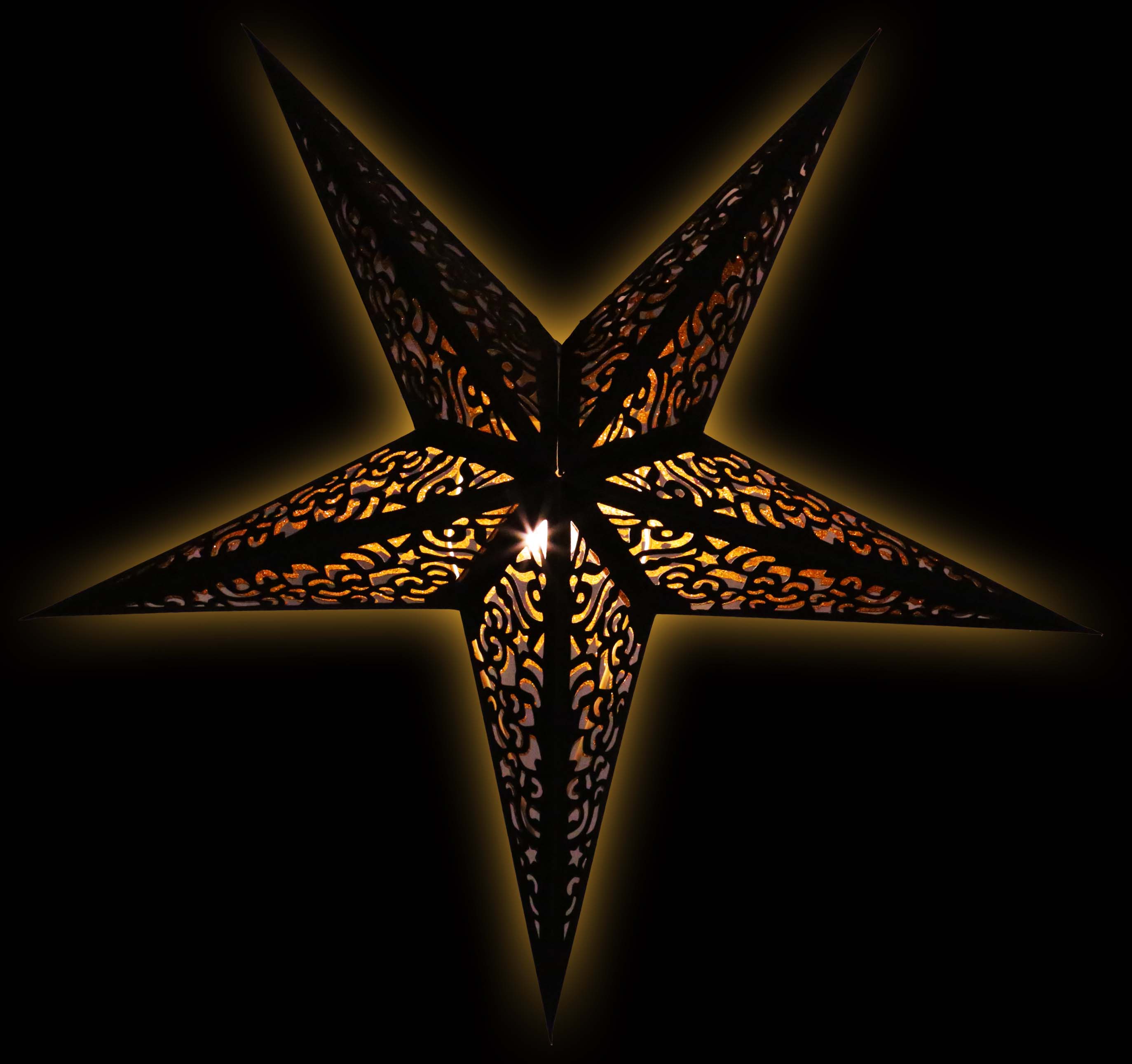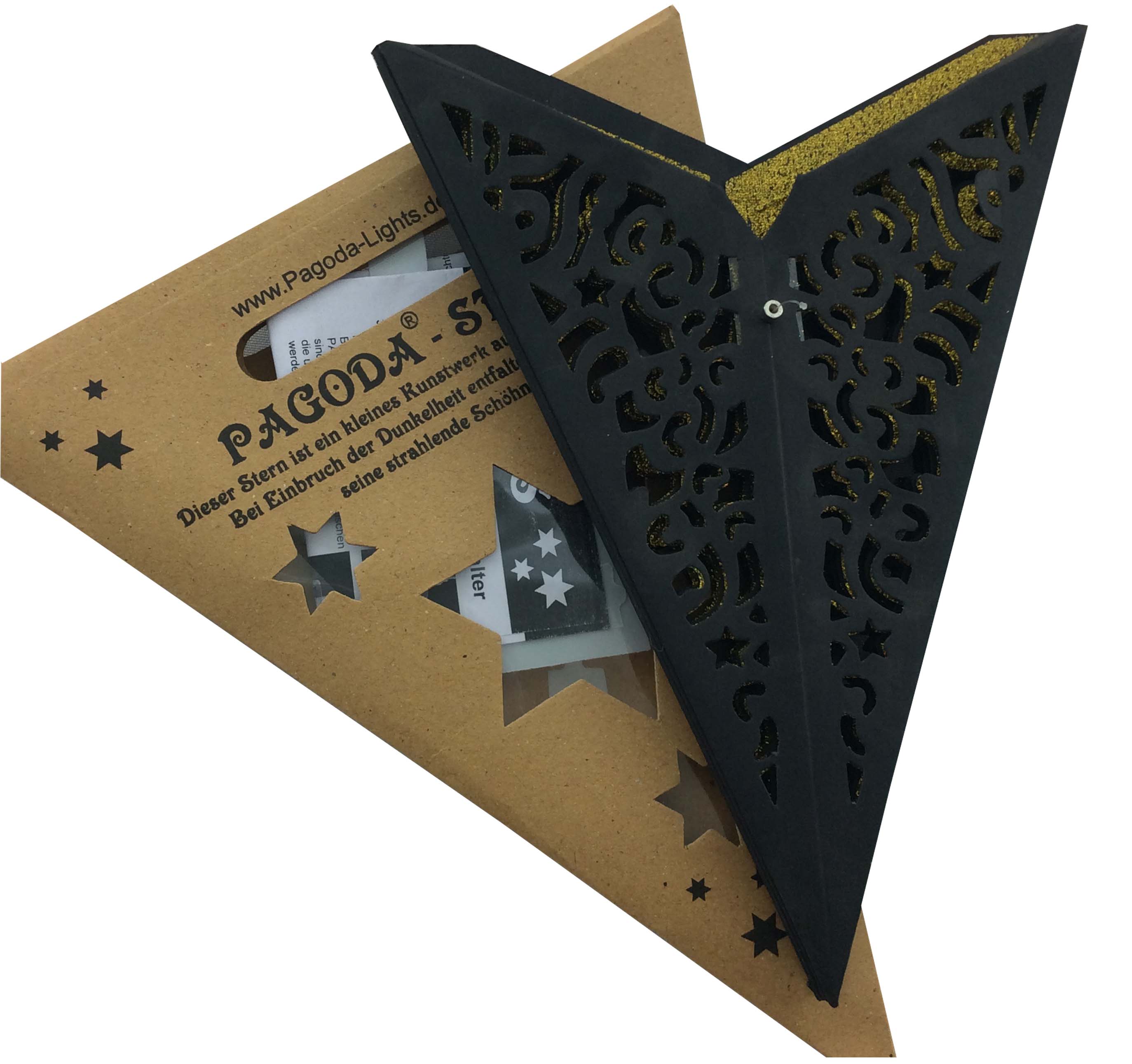 Original Pagoda Stern mit 5 Zacken aus festem Papier. Das Muster wurde in sorgfältiger Handarbeit ausgestanzt und auf der Innenseite mit Goldglitter verziert.