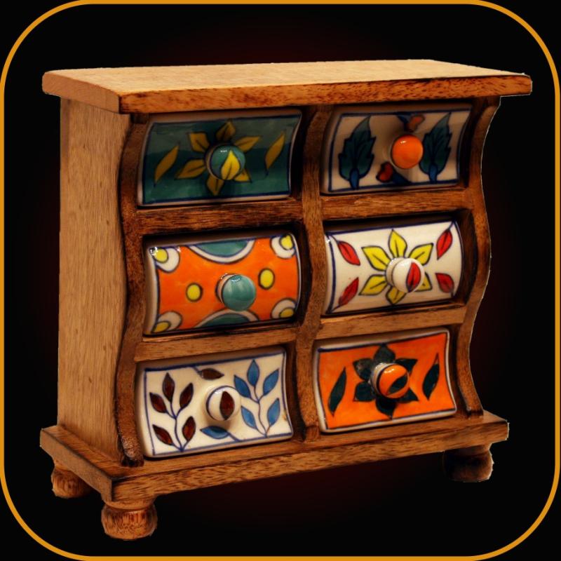 Dieses kleine dekorative Dekoschränkchen aus Shisham Holz hat sechs kleine von Hand bemalte Keramikschubladen, welche alle individuell von Hand bemalt worden sind. Daher können die Muster von der Abbildung abweichen.