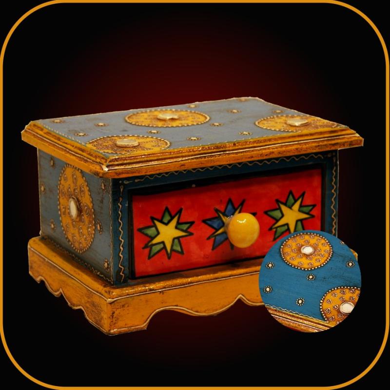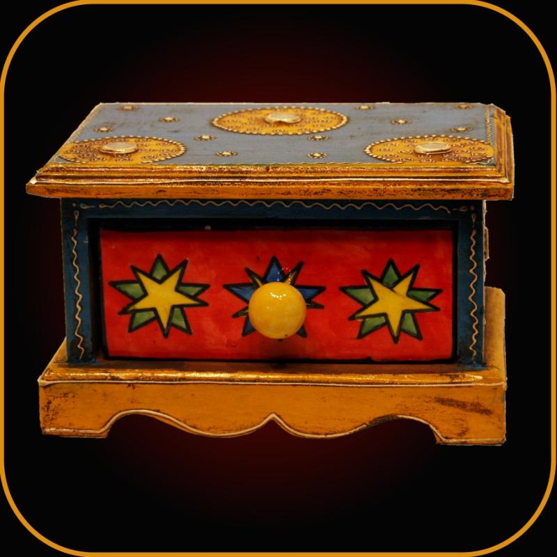 Dieses kleine reich verzierte und handbemalte dekorative Dekoschränkchen aus Shisham Holz hat 1 kleine von Hand bemalte Keramikschublade.