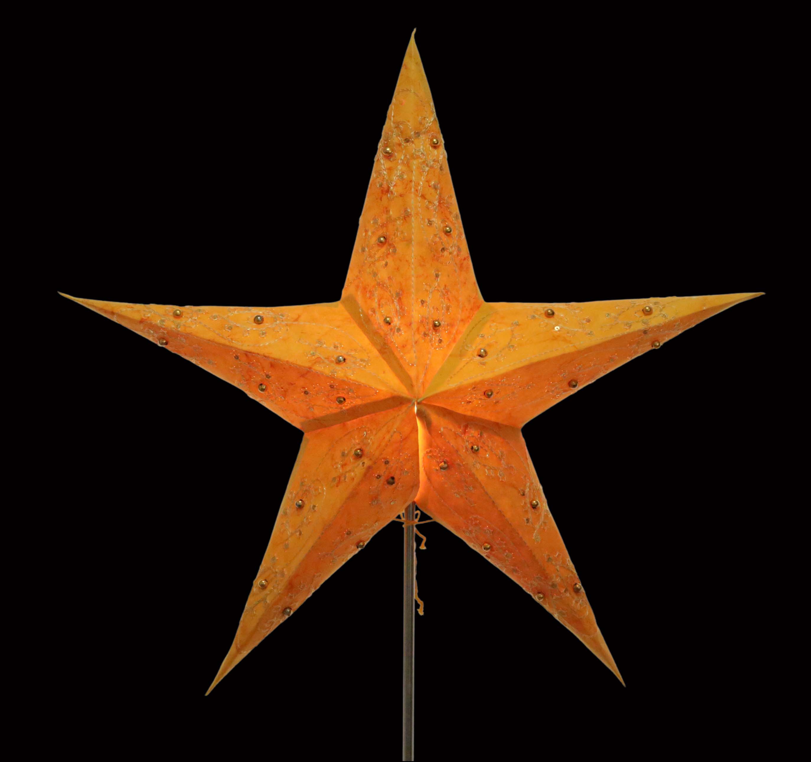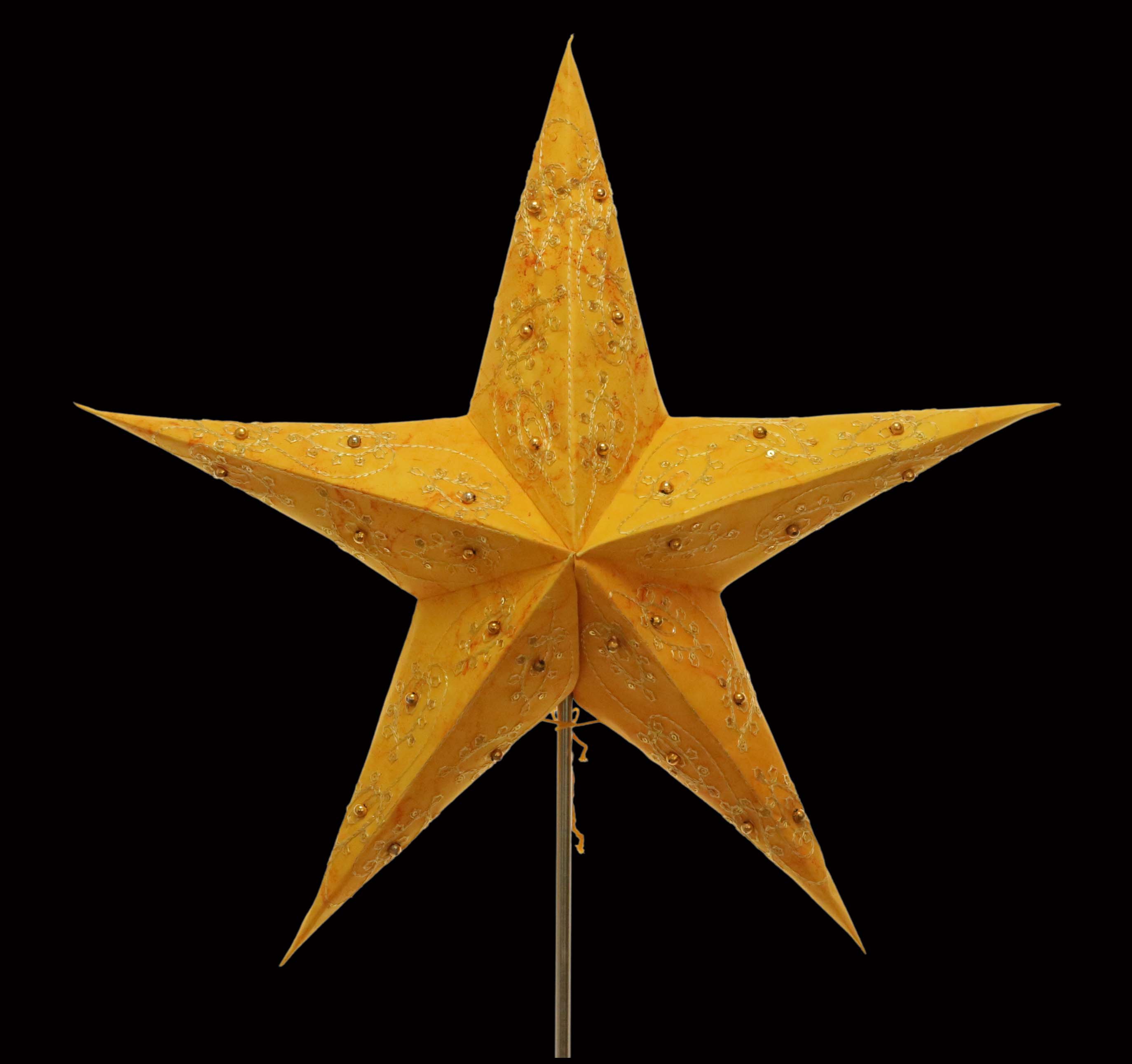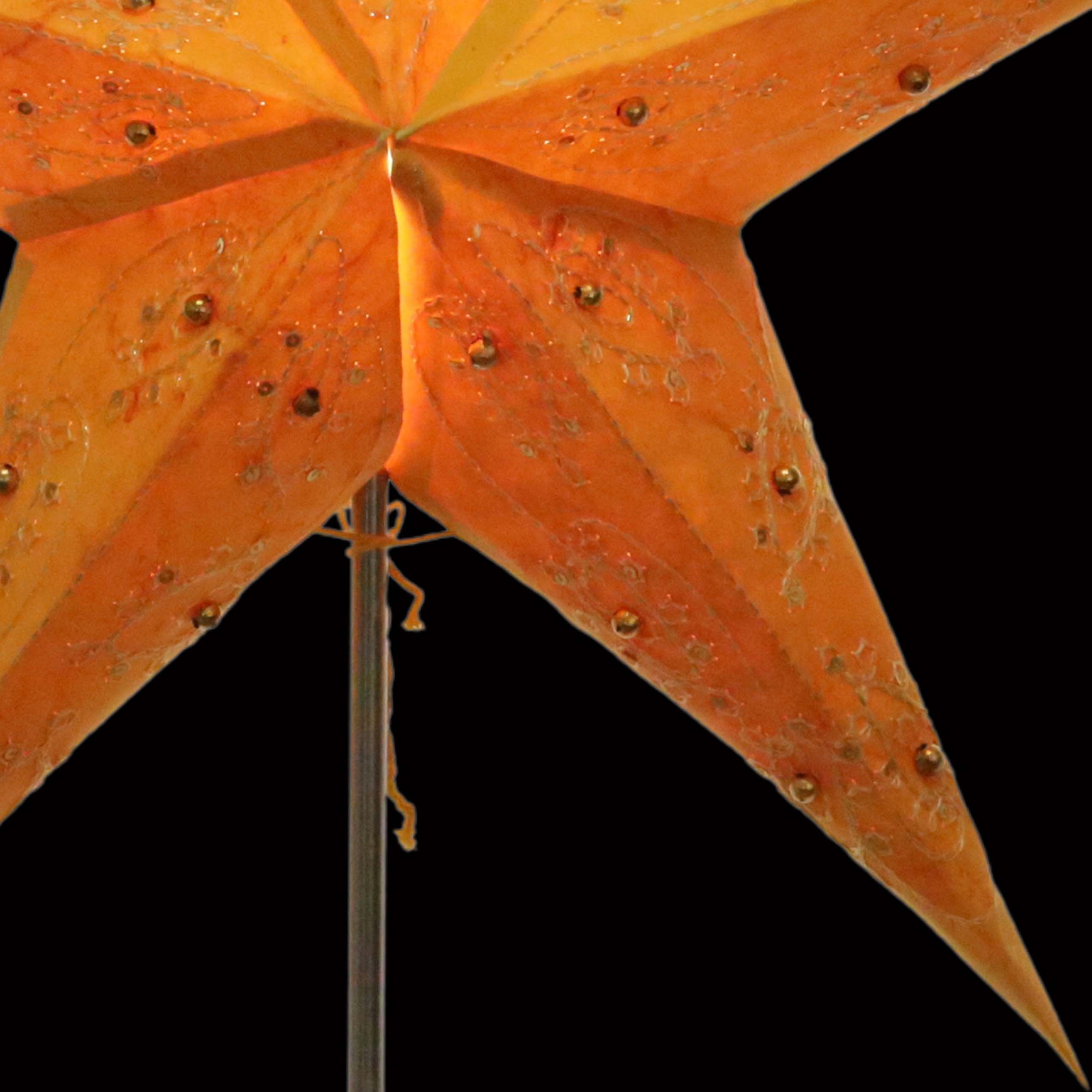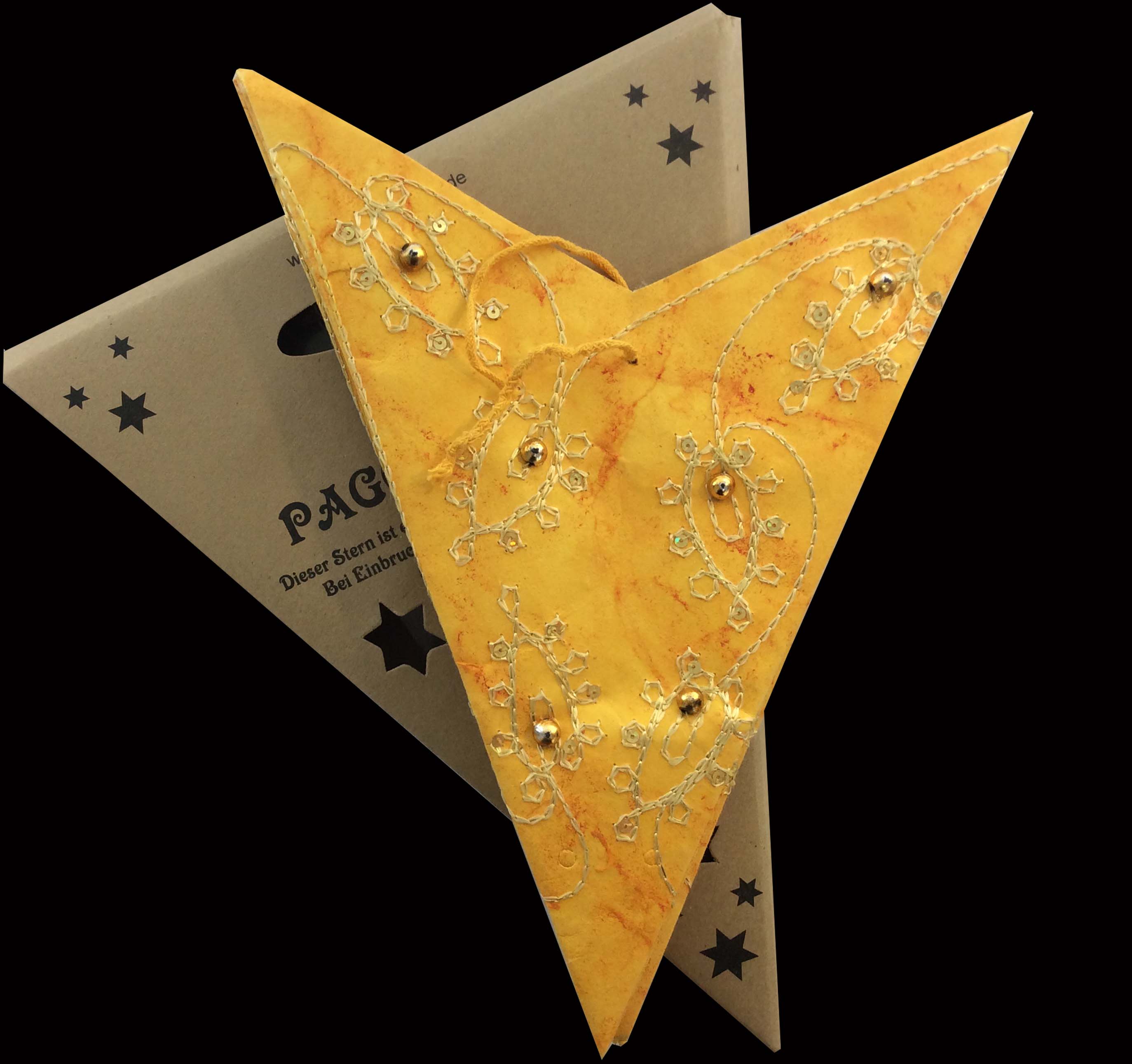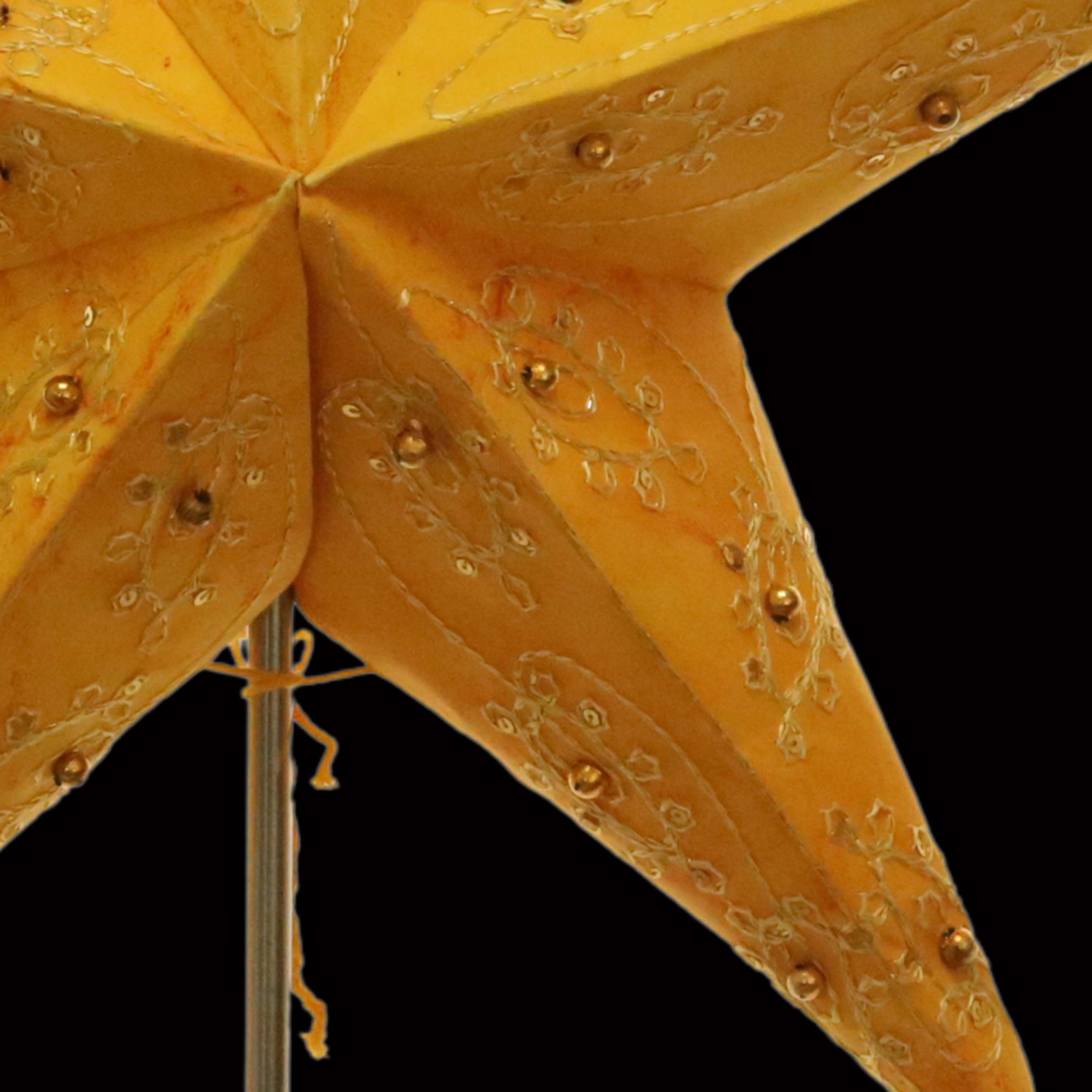 Original Pagoda Stern mit 5 Zacken aus festem Papier. Das Muster wurde in sorgfältiger Handarbeit ausgestanzt, gebatikt, bestickt und mit Goldperlen verziert.