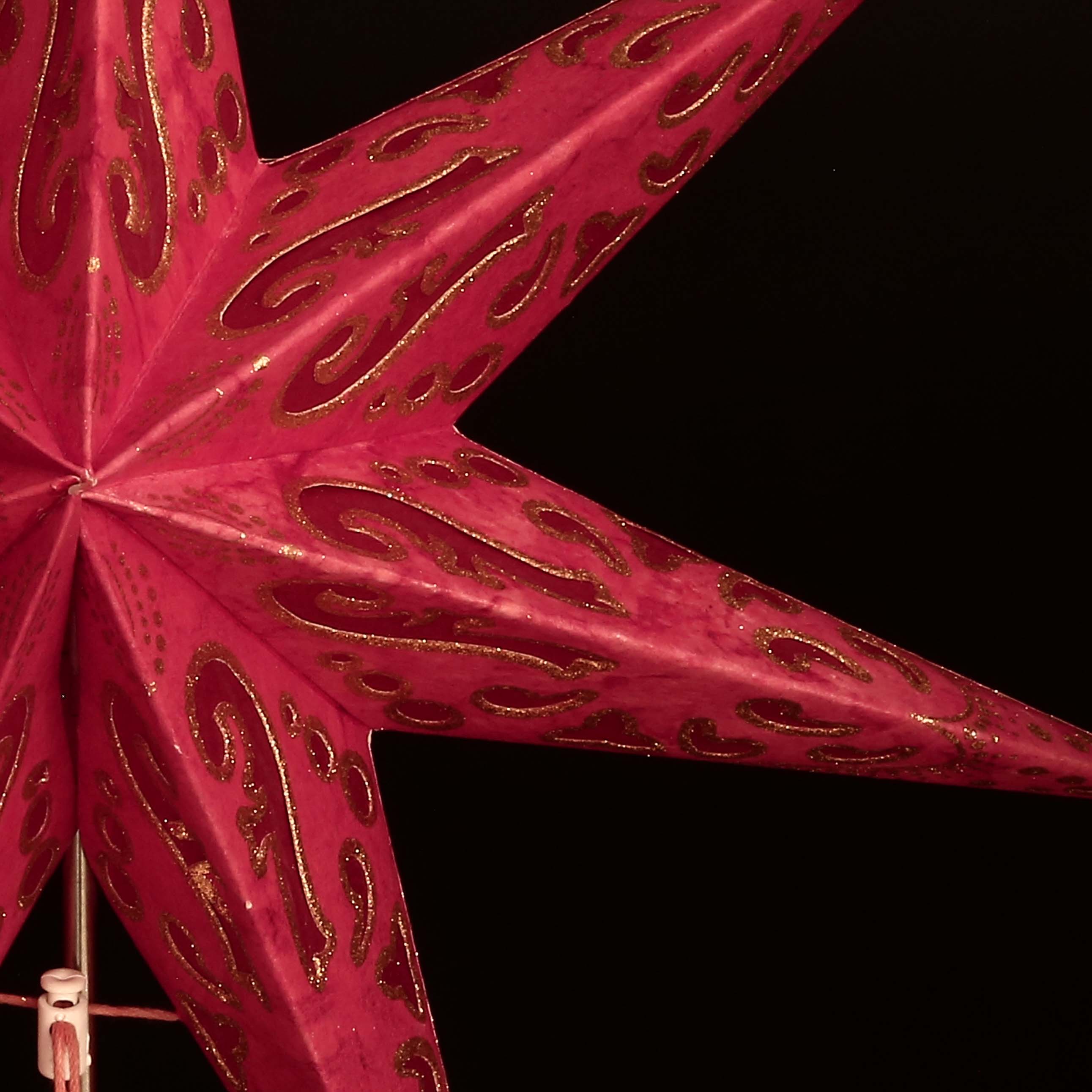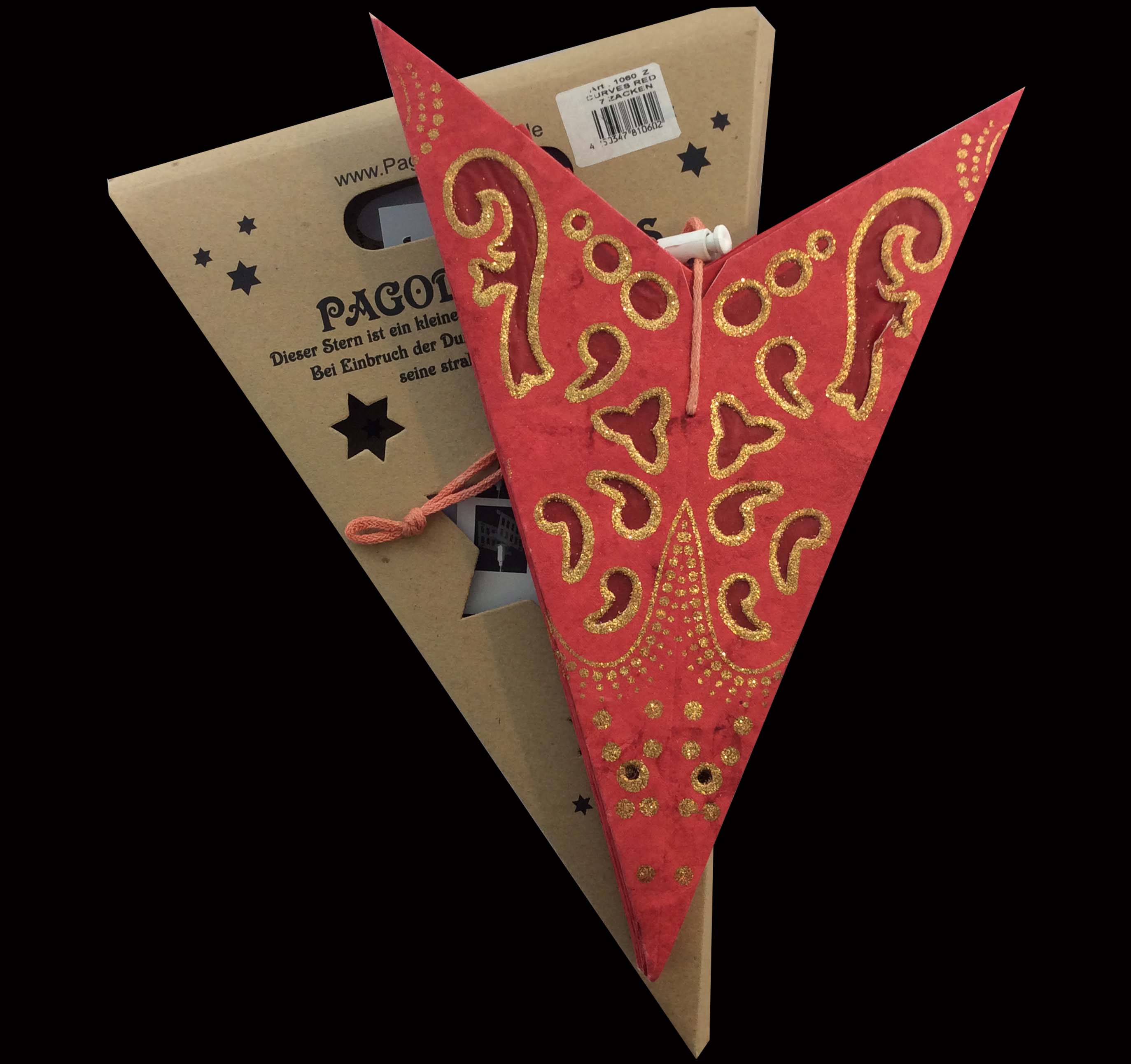 Original Pagoda Stern mit 7 Zacken aus festem Papier. Das Muster wurde in sorgfältiger Handarbeit ausgestanzt, gebatikt, hinterklebt und mit Goldglitter verziert.