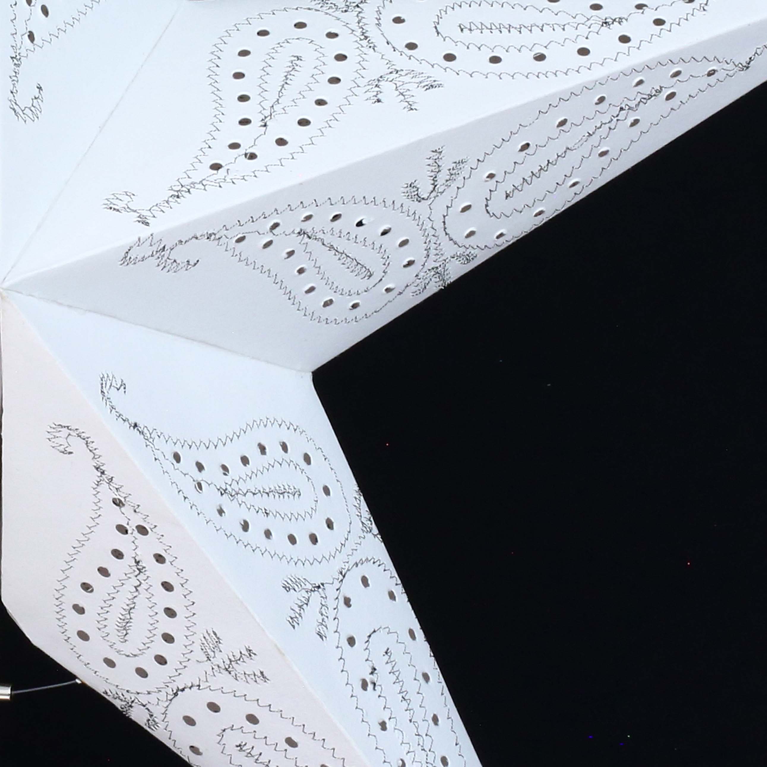 Original Pagoda Stern mit 5 Zacken aus festem Papier. Das Muster wurde in sorgfältiger Handarbeit ausgestanzt, gebatikt, bestickt und geklebt.