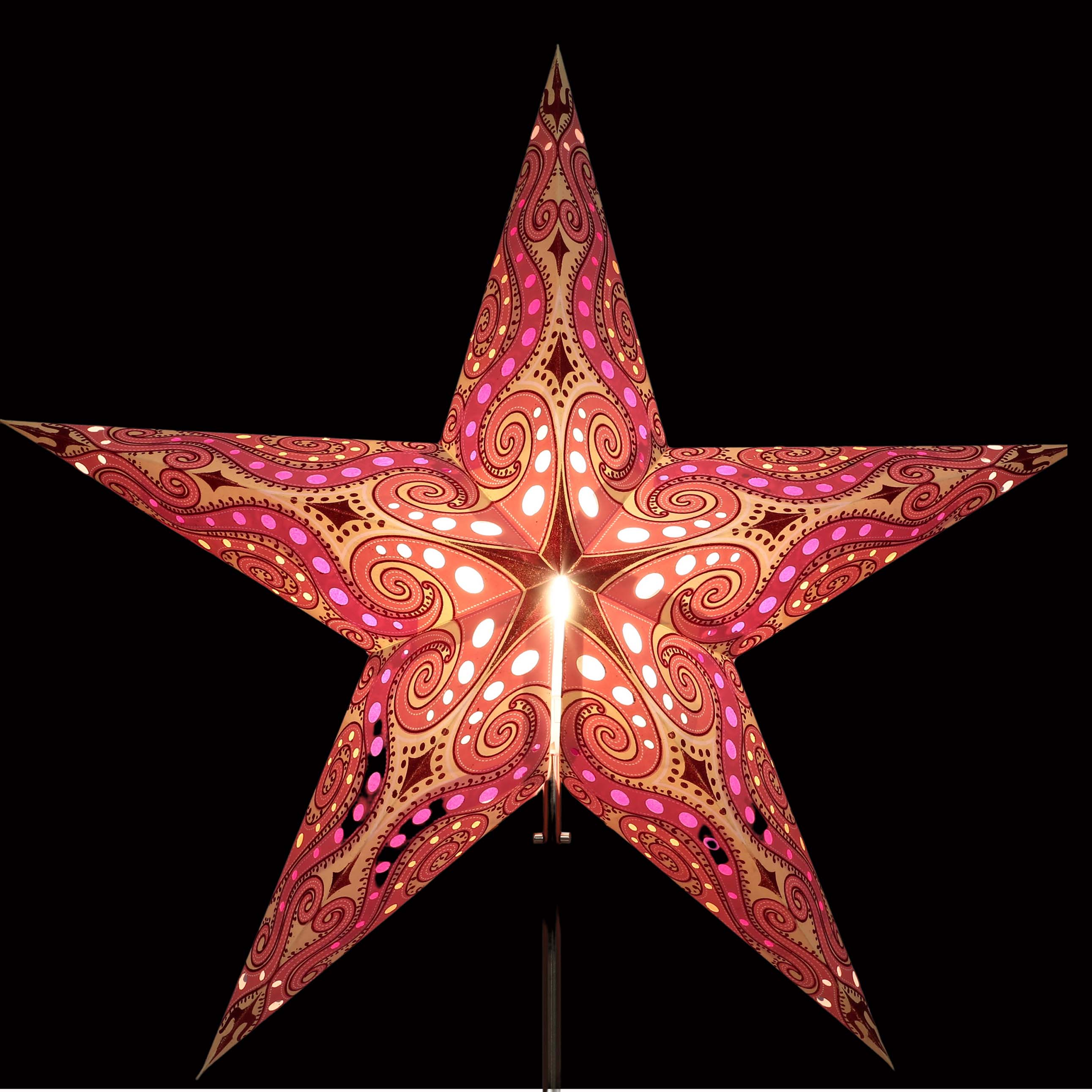 Original Pagoda Stern mit 5 Zacken aus festem Papier. Das Muster wurde in sorgfältiger Handarbeit ausgestanzt, mit Transparentpapier hinterklebt, mit rotem Gliter verziert und geklebt.