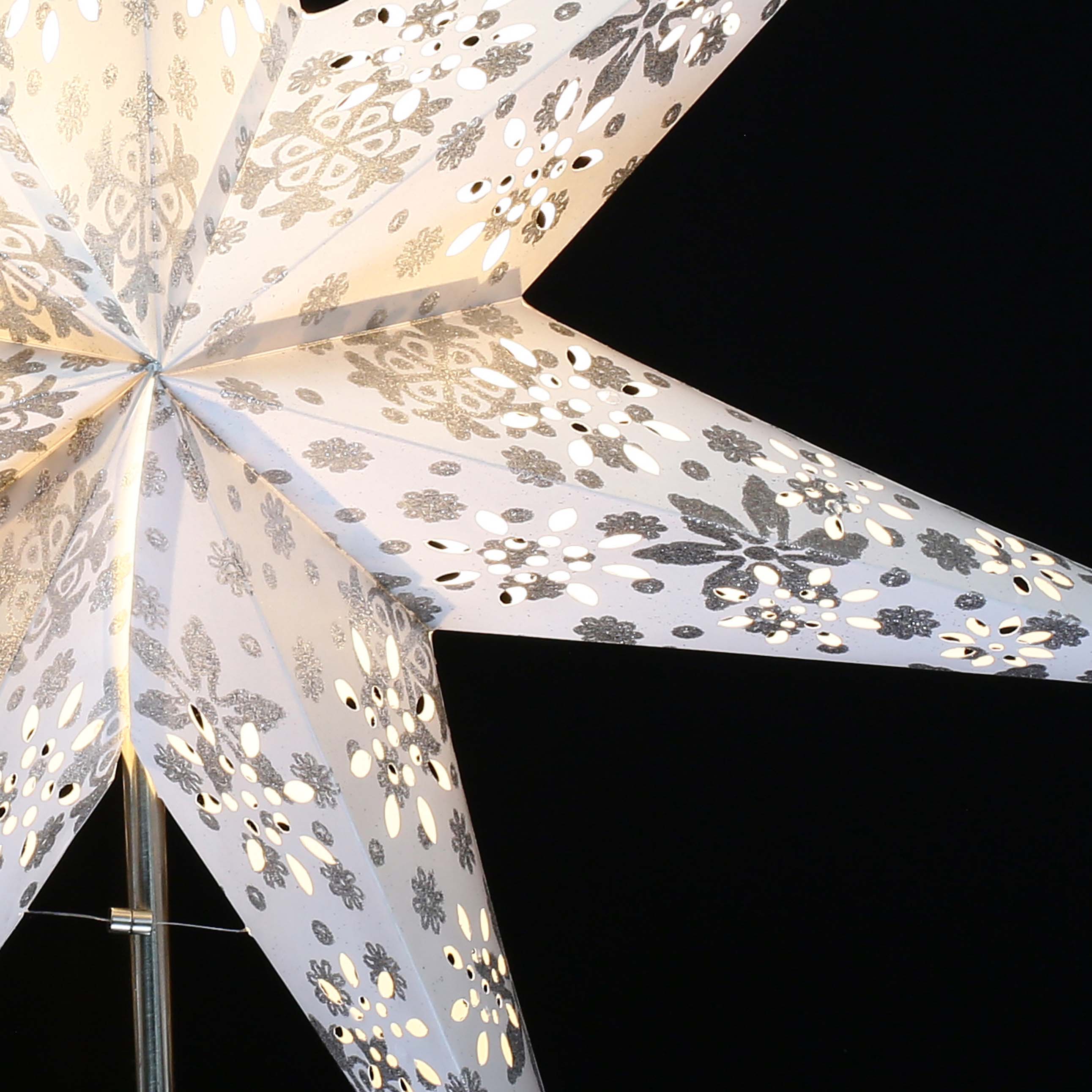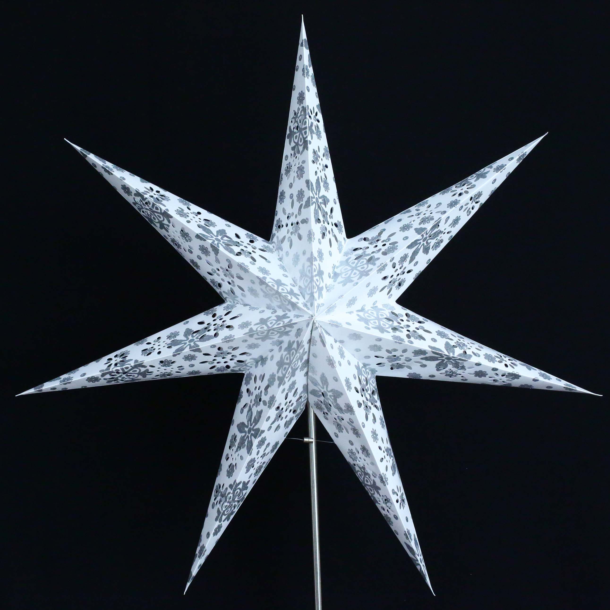 Original pagoda star with 9 points made of strong paper. The pattern was carefully punched out and decorated with silver Glitter by hand.