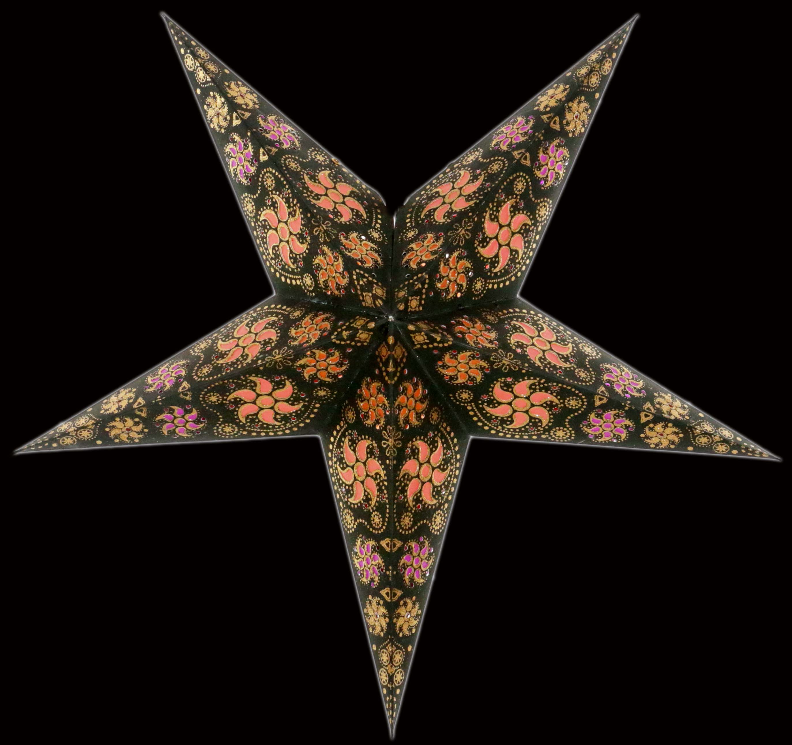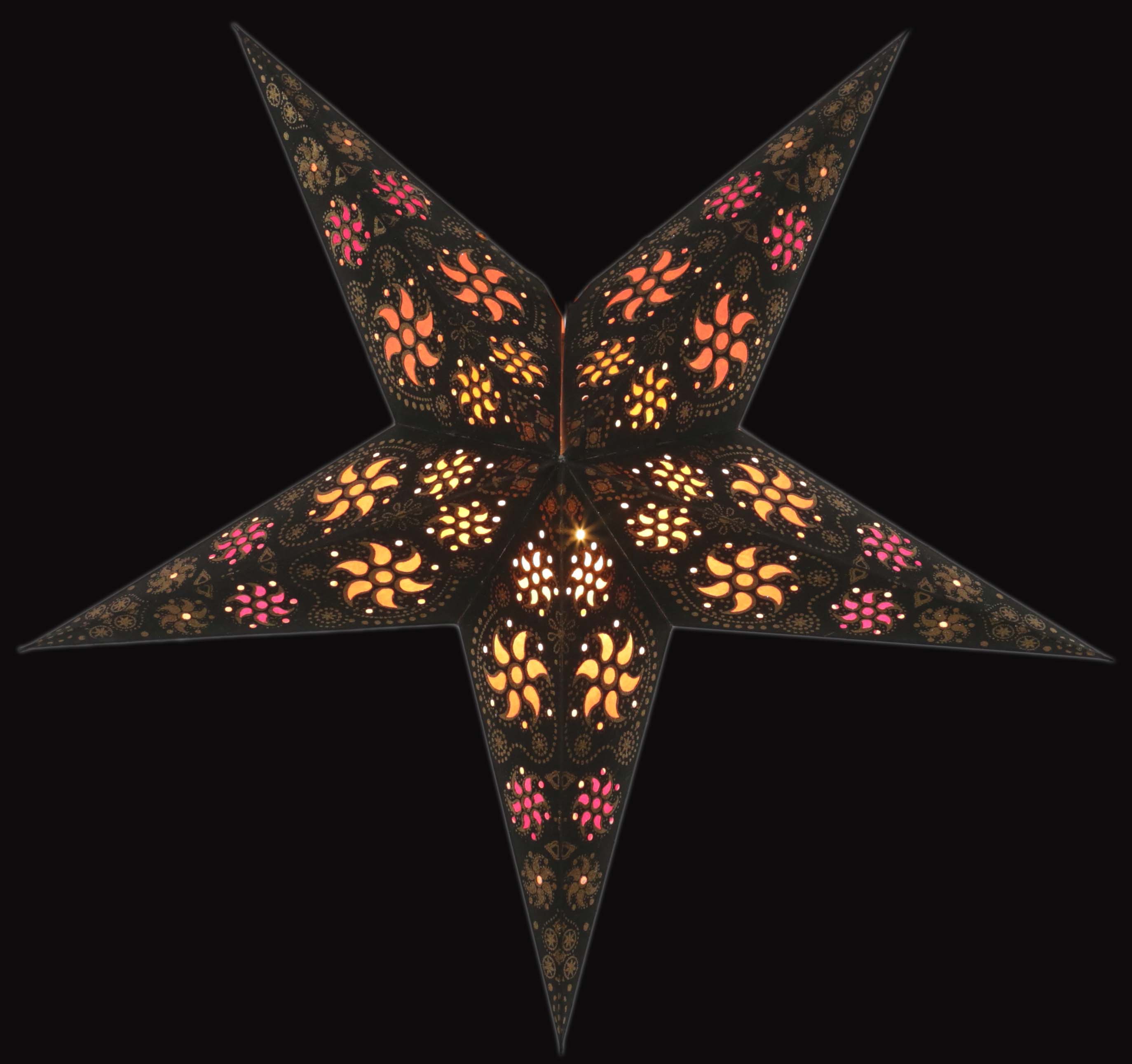 Original pagoda star with 5 points made of strong paper. The pattern was carefully punched out, pasted and decorated with gold glitter